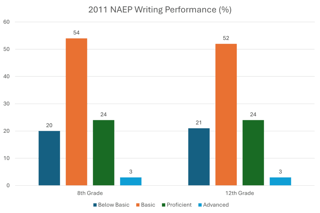 According to results from the NAEP 2011 writing assessment of 8th and 12th grade students, around three out of four students, did not have skills/knowledge sufficient to communicate clearly! Only the rare few (< 3%) demonstrated an Advanced (superior) proficiency level, and only one in four students (~3%) achieved Proficiency (skills/knowledge sufficient to communicate clearly).