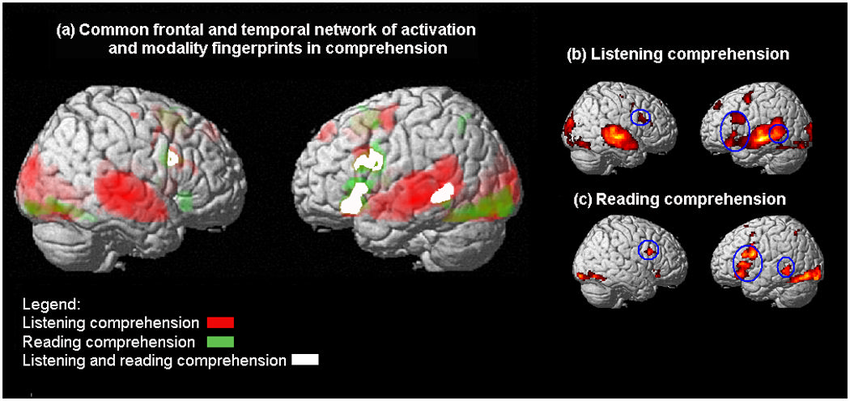 The regions of the brain one uses to comprehend what one hears have some crossover with the regions of the brain one uses to comprehend what one reads. This concept is observed in the results of brain imagery studies that map brain activation under each condition. The takeaway from the study is that a few of the same pathways activate when trying to comprehend by listening and when trying to comprehend by reading. This finding demonstrates the brain’s ability to perform similar functions (comprehension) under disparate conditions!