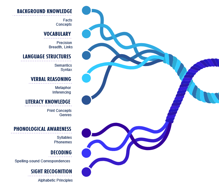 Noted researcher, psychologist, and literacy expert, Dr. Hollis Scarborough translated the findings regarding the brain’s role in learning to read from neuroscience to education. Scarborough characterized the elements and process of reading development with a graphic illustration of the skills and knowledge learners gain to become increasingly fluent readers.