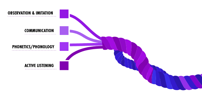 Learning to speak begins with listening to the sounds a caretaker makes when speaking. The learner decodes sounds and mimics them before gaining some understanding of what those sounds (connected phonemes) mean. These actions take place during the listening and speaking phase of language acquisition. The skills one develops when acquiring spoken language activate some, but not all, parts of the brain–that is, they are amodal.