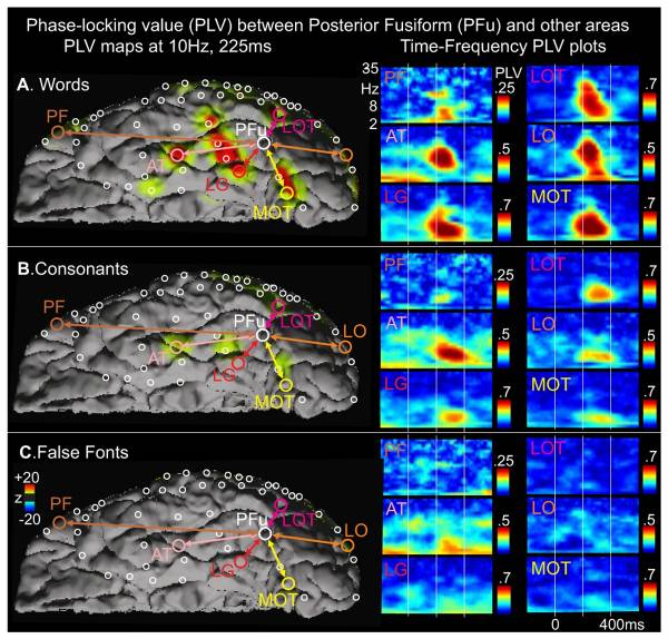 Functional Magnetic Resonance Imaging (fMRI) shows that there is greater activity (the red and yellow spots in the two right columns of images) in the brain when reading words than when recognizing letters (specifically, consonants), and the brain is least busy when seeing false fonts (letter-like figures arranged in a string resembling a word). These findings illustrate that as reading development progresses from nothing to letters to words, brain activity increases and forms more extensive neuronal pathways–that is, connections between neurons.