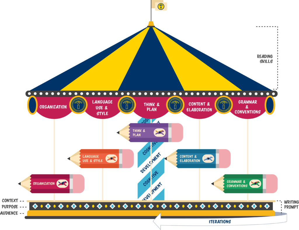 Each station on the carousel aligns with a category of knowledge and skills writers are going to further develop as they engage in the writing process. These stations–Think/plan, Content & Elaboration, Organization, Language & Style, Grammar & Conventions–align with categories of development in the Writing Rope. At any given point in “the ride,” one station might be higher than others, a condition that’s realistic. After all, aspects of a communication, such as organization or language, are not perfectly balanced at every stage of revision.